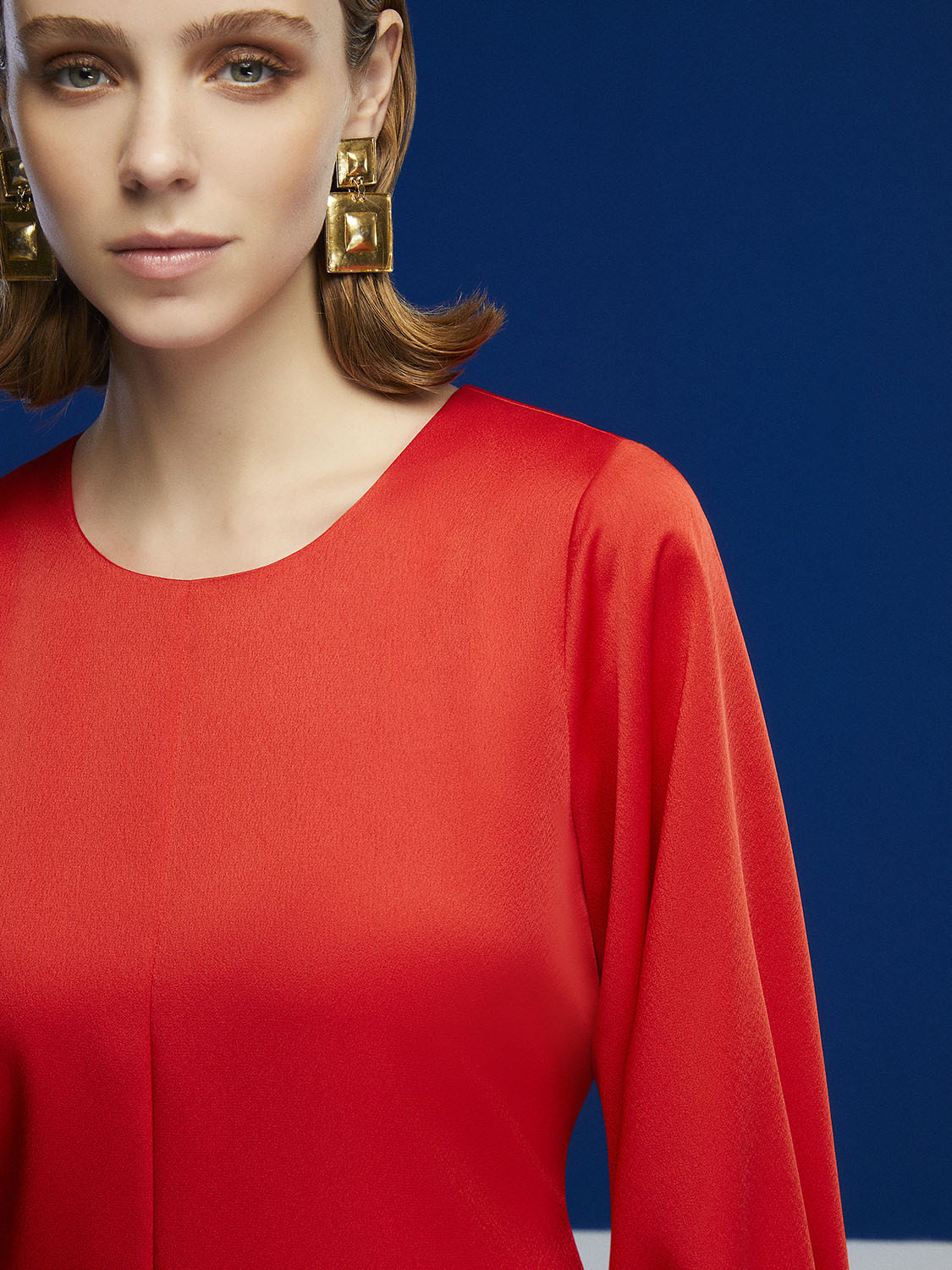 Crew-neck dress with below-the-elbow length sleeves and self-belt. Back zipper closure.